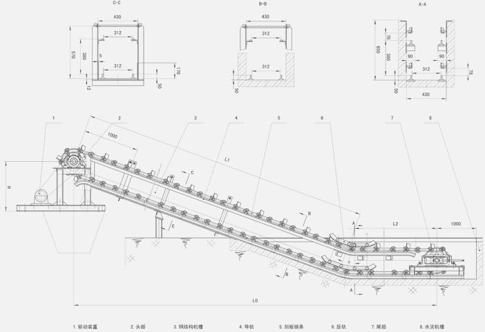 一條刮渣機可以有水平段和傾斜段變角度輸送,傾斜段的傾角可達40°。