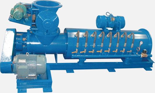 除塵器處理回收的粉塵經(jīng)過下料卸灰閥進(jìn)入DSZ系列加濕攪拌機(jī)的入料斗內(nèi),由卸灰旋轉(zhuǎn)葉輪將灰塵送入機(jī)體內(nèi)的螺旋輸送葉片上,經(jīng)螺旋推入加濕攪拌主筒,在螺旋體均勻的拌料下,水噴淋均勻注入料內(nèi),在勻速攪拌的作用下,使粉塵加濕,加濕后的粉塵在多柱螺旋線性的推力作用下,從出料口緩緩送出,卸入機(jī)體外的粉塵運(yùn)送裝置。在螺旋體的勻速運(yùn)轉(zhuǎn)時(shí),振動(dòng)裝置間歇性的工作,使拌料筒周壁等變幅振蕩,將加濕后的粘性粉體與金屬筒壁脫離,完全送至卸料口排出。